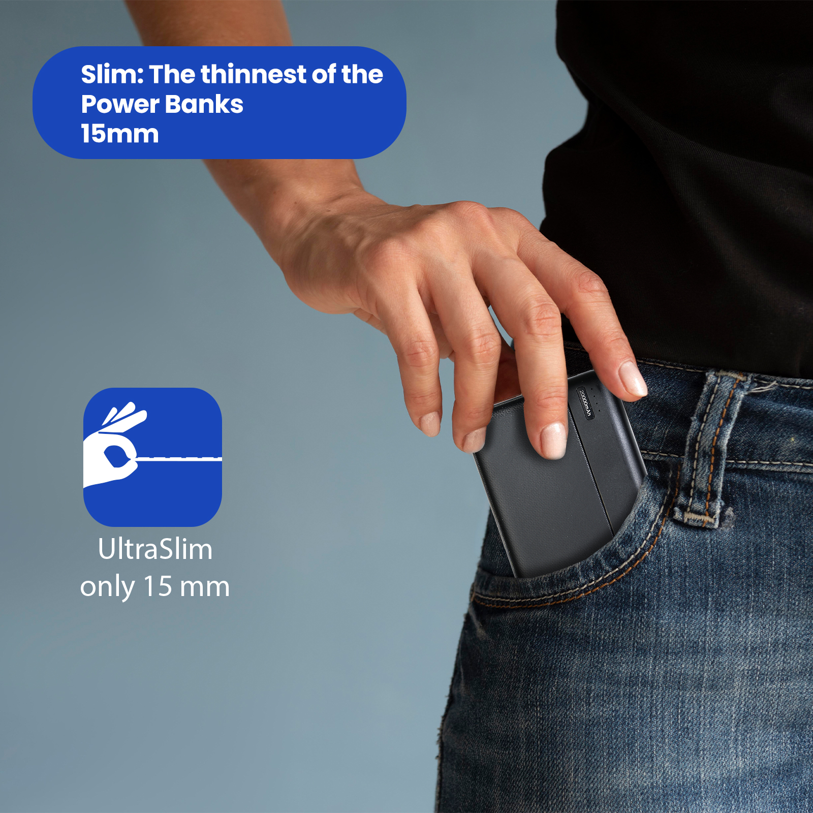 - Fast PD 22.5W charging – Supports Power Delivery (PD) and Quick Charge (QC), providing ultra-fast charging for a wide range of devices. - Simultaneous charging of 3 devices – The USB-C and USB-A outputs allow you to charge three devices at once, making it easier to use while traveling or sharing with friends. - Additional Micro-USB input – The inclusion of an additional Micro-USB input makes this power bank even more versatile, allowing the use of old cables and an extra connection option. - UltraSlim design – At just 15mm thick, this power bank is extremely compact and portable, perfect for keeping in your pocket or bag. - Ultra-fast charging – 60% battery charged in 30 minutes, using PD QC 22.5W technology for more efficient charging. - USB-C and USB-A outputs – Equipped with USB-C and USB-A ports, the Compact model fits perfectly with USB-C charging devices like iPhone, iPad, and other modern devices. - 5-year warranty and certified safety – Made with high-quality materials, this power bank complies with safety standards and includes a 5-year warranty.