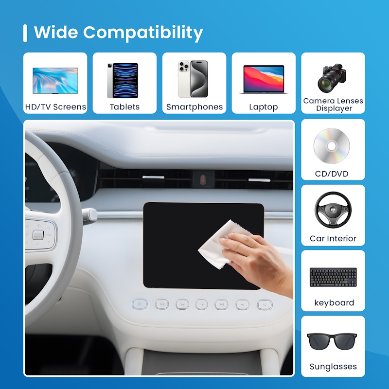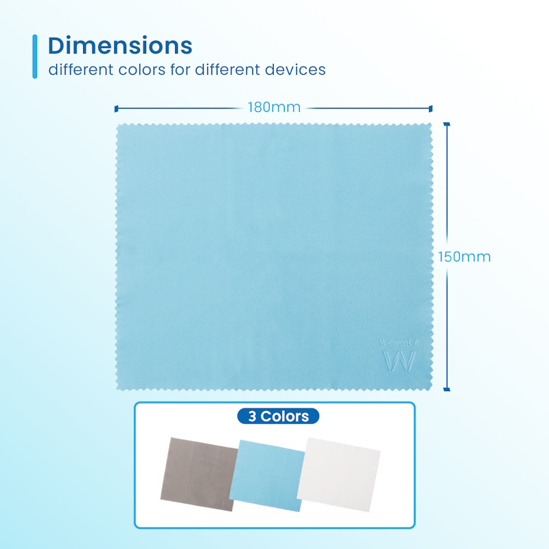 For cleaning screens, lenses, glass, fiber optics, plastic, and printer surfaces - Suitable for functional uses such as: cleaning screens, lenses, fiber optics, glass, plastic surfaces, and printer surfaces. Also useful as a screen protector - Antistatic: attracts fine dust, ideal for cleaning delicate electronic devices - Extremely soft, lint-free, and 100% safe for cleaning dust, streaks, smudges, fingerprints, oils, marks from screens, glasses, lenses, binoculars, telescopes, jewelry, and other delicate surfaces - Made from high-quality, tightly woven microfiber material - Reusable and long-lasting: easy to wash and quick-drying. Hand wash with water only—do not use detergent or fabric softener, do not bleach, air dry only - Compact size: each cloth measures 15x18 cm; 6-pack (2x White, 2x Gray, 2x Blue) - Individually packed: each cloth is neatly and individually packaged in a clear bag