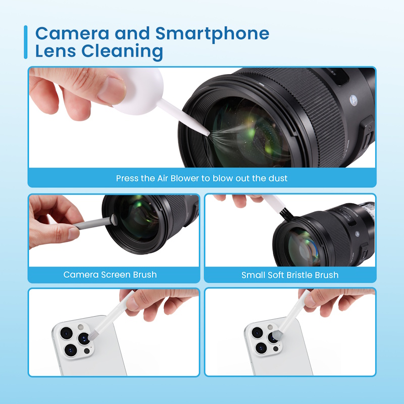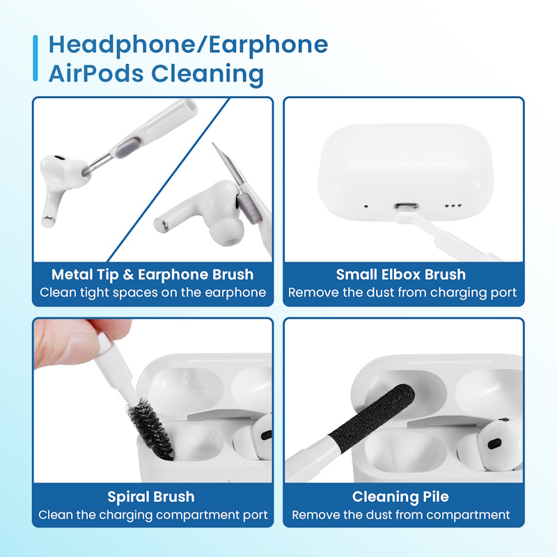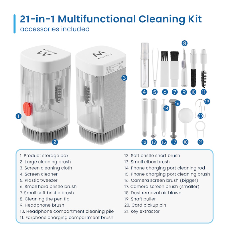 For Headphones/Earphone, Keyboards, PC Monitors, Smartphones, Tablet, Cameras, Screens - The cleaning kit provides 21 kinds of cleaning tools, including cleaning cloth, brush, air blower, etc. ideal for cleaning the surface, screen, lens and other parts of Bluetooth headphones, mobile phones, cameras, lenses, keyboards and other devices. - Retractable brush for cleaning electronic and non-electronic accessories, easily removes dust without scratching - Airpods cleaning pen with mini tip to go deep. Equipped with small brush for external cleaning - Application: Suitable for Headphones/Earphone, Keyboards, PC Monitors, Smartphones, Cameras, Screens cleaning - Key extractor ring for a deeper cleaning of the keyboard with the semi-soft brush - Compact and lightweight: the integrated case makes it easy to carry Accessories included: 1pz Product storage box 1pz Large cleaning brush (for keyboard and screens) 1pz Screen cleaning cloth 1pz 3ml Cleaning Spray Bottle (Empty) 1pz Plastic tweezer 1pz Small hard bristle brush 1pz Small soft bristle brush 1pz Cleaning the Pen Tip 1pz Headphone brush 1pz Headphone compartment cleaning pile 1pz Earphone charging compartment brush 1pz Soft bristle short brush 1pz Small elbow brush 1pz phone charging port cleaning rod 1pz phone charging port cleaning brush 1pz Camera screen brush bigger 1pz Camera screen brush smaller 1pz Dust removal air blown 1pz Shaft puller 1pz Card pickup pin 1pz Key extractor