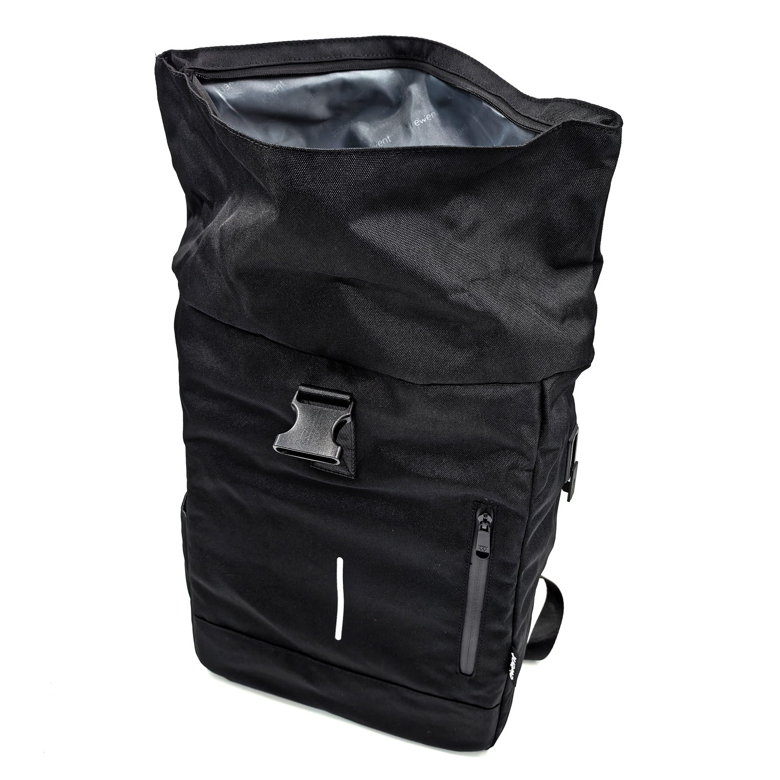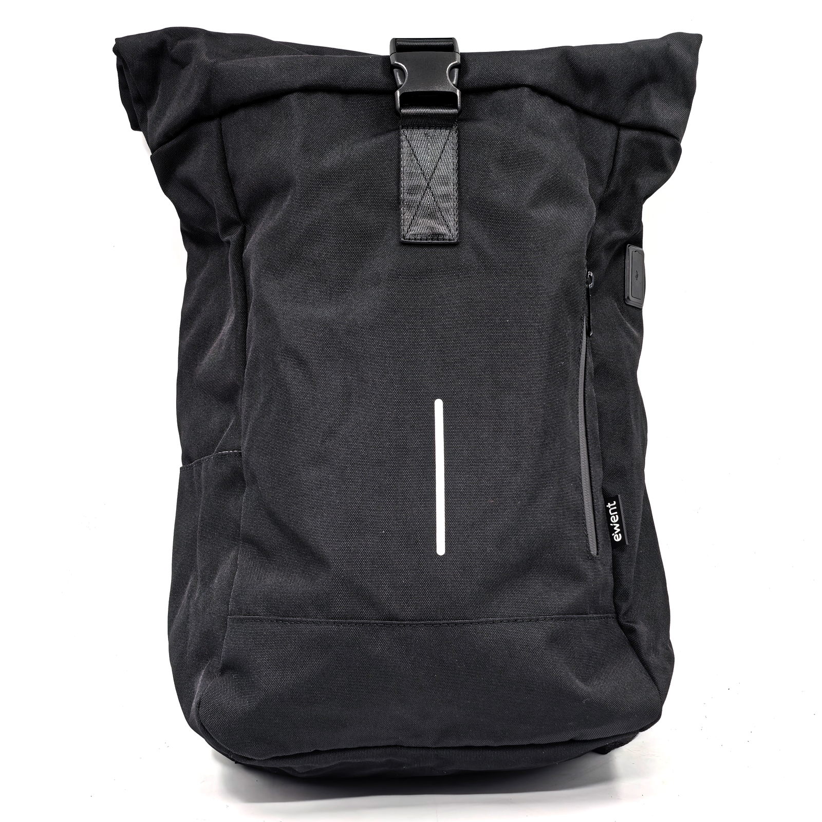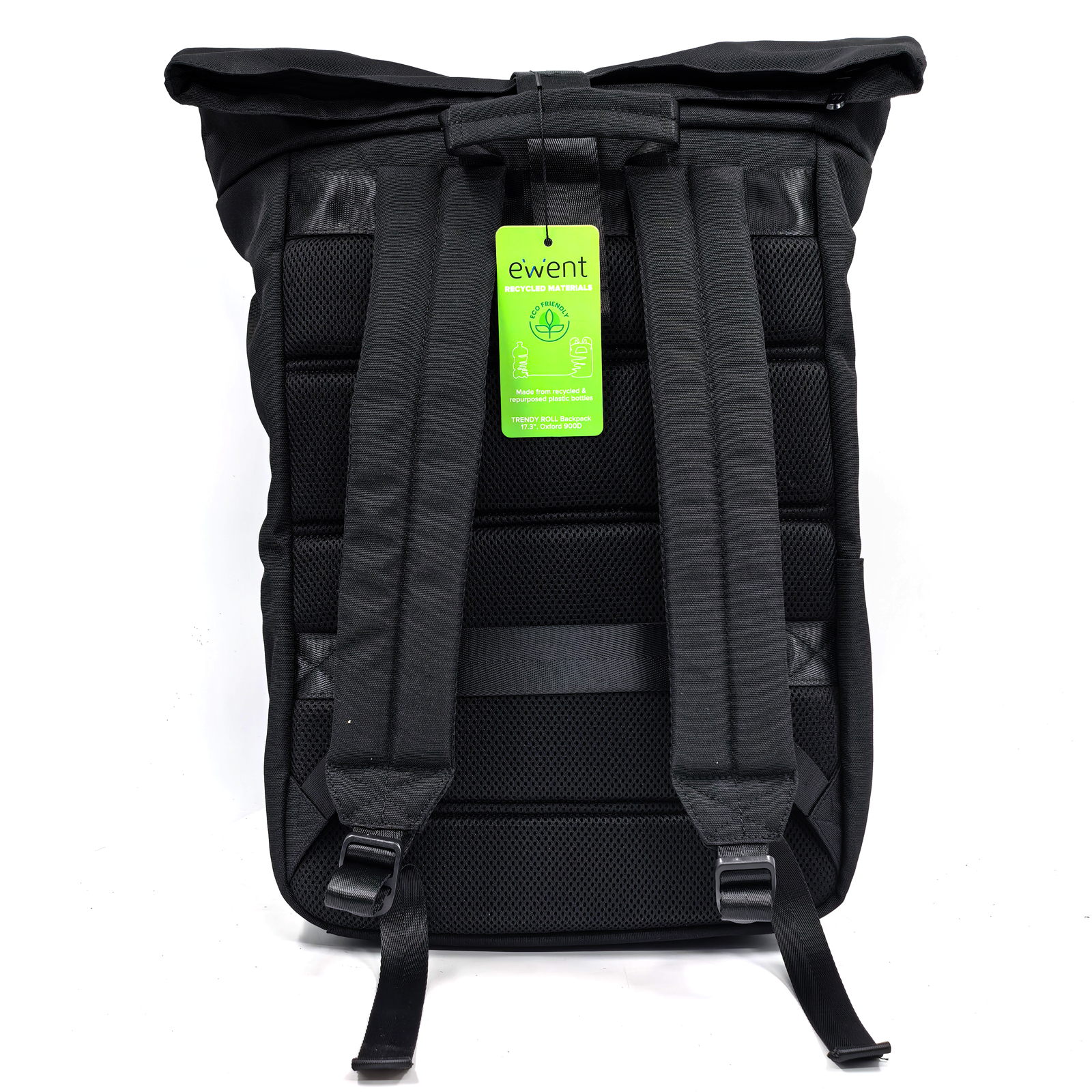 With anti-theft pocket, trolley strip and reflective strip - Expandable Storage Space: Regular size: 50x32x14 cm, extended size: 64x32x14 cm. Roll-top makes this backpack capable of being used in two sizes for multi-purpose use; its volume expands from 25,5L to 34L to suit your needs. Its spacious internal volume features a main compartment with padded laptop compartment. The space is suitable for a 17.3" laptop, a change of clothes, books, a water bottle, etc. - Waterproof and Durable: This Unisex rolltop backpack is lightweight and durable, made of waterproof and tear-resistant 900D Oxford fabric on the outside. Ideal for extended outdoor activities. All stress points are reinforced for extra durability. Made from recycled PET bottles. That means you're making a sustainable purchase without having to compromise on quality or style. - The backpack features a fully padded and breathable backrest and shoulder straps. This allows for greater comfort when using it. - Reflective strip. To provide greater safety, the Ewent Trendy Roll backpack includes a high visible reflective strip. The reflective strip is easily visible at night from a distance, helping to avoid unwanted accidents or helping to be seen easier for any other reason - Anti-theft pocket. This zippered pocket located on the back of the backpack prevents it from being accessible to unwanted people while you are wearing the backpack. Prevents theft. - Trolley strap. This strap allows you to attach the backpack to the extendable handle of your trolley when you move through airports, train stations, etc., without having to carry your backpack at the time.