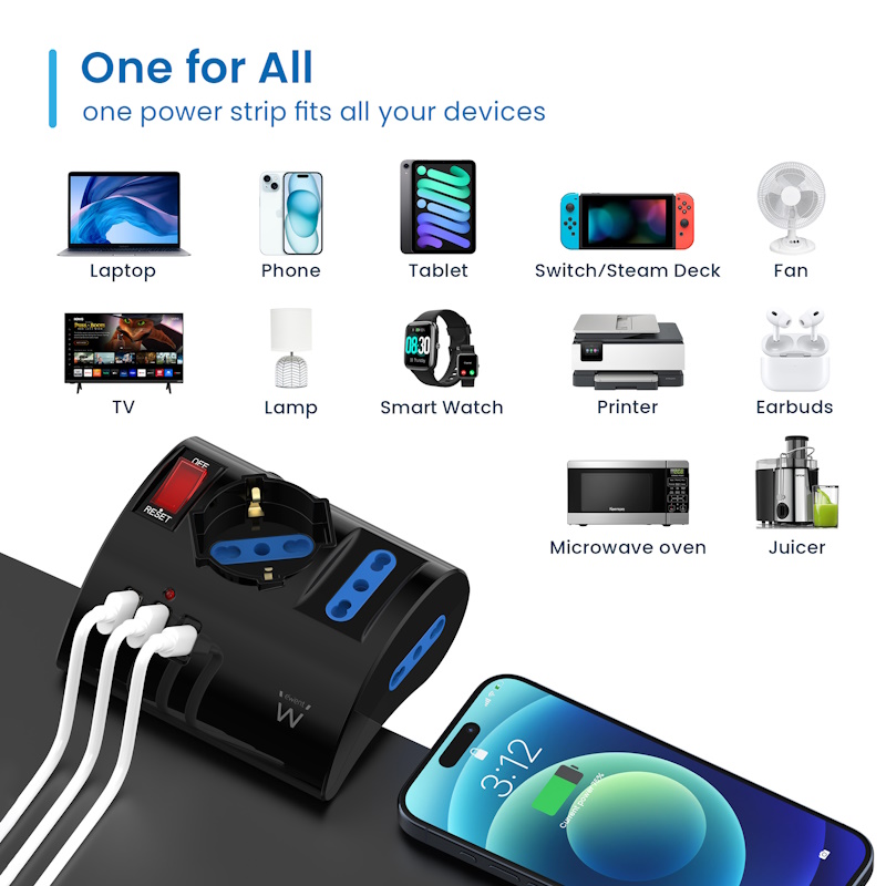 - 2 Italian/Schuko electrical sockets to power 3 electrical devices; 2 normal USB type A ports and 1 USB type C port (5V/3A - PD / QC 3.0) to charge the most modern and up-to-date tablets/smartphones and electronic devices - Enable and disable all electrical outlets and USB ports at once with the illuminated ON/OFF power switch - Modern design that does not take up space: all electrical outlets and USB ports are easily accessible - Safe Charging: The power strip is equipped with overload protection - Cable: length 1.5 m - 4 non-slip feet to ensure you don't slip or fall off the table