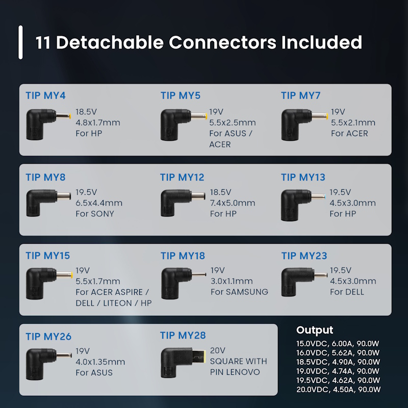 - Power connectors: 11 power plugs - Maximum power: 90W - Input: 100V ~ 240V AC 50/60Hz, 2A Max - Output: 15.0VDC, 6.00A, 90.0W 16.0VDC, 5.62A, 90.0W 18.5VDC, 4.90A, 90.0W 19.0VDC, 4.74A, 90.0W 19.5VDC, 4.62A, 90.0W 20.0VDC, 4.50A, 90.0W - Converter Efficiency > 88% - Size: 132 x 57 x 28 mm - Charger weight: 322 gr - Protection: Over Voltage, Over Current, Short Circuit, Over Temperature - Cable DC length: 1.5mt - Cable AC length: 1.5mt