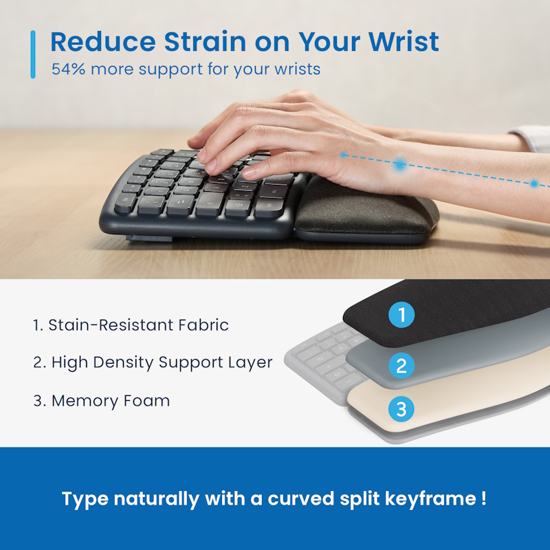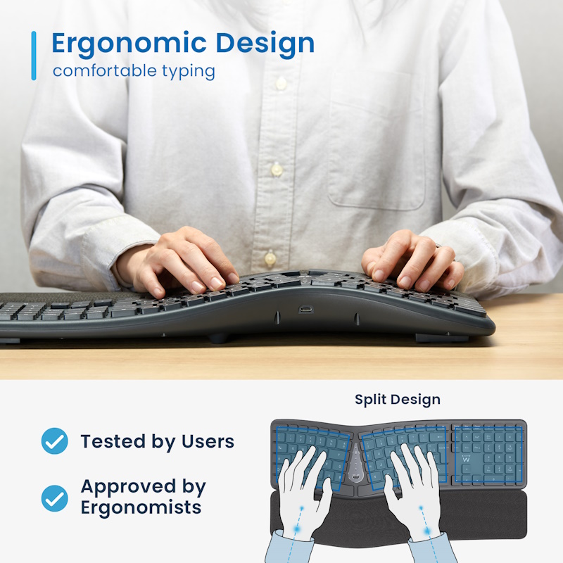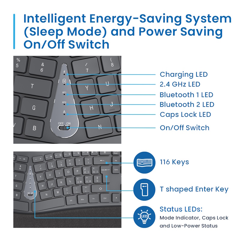 Wireless 2.4ghz | Bluetooth 1 | Bluetooth 2 - Ergonomico Poggia-polsi integrato con tessuto: digitazione naturale grazie a design curvo e diviso - Tasti Silenziosi che riducono il rumore. Membrana impermeabile resistente agli schizzi - Utilizza fino a 3 dispositivi contemporaneamente - Connessione tramite Bluetooth e Wireless 2.4Ghz con ricevitore - Ricevitore con connettore USB-A; facilmente riponibile all'interno della tastiera - 12 tasti multimediali - Batteria al litio ricaricabile da 300Mah: Funzione di risparmio energetico intelligente per un uso prolungato della batteria. - Interruttore On/Off